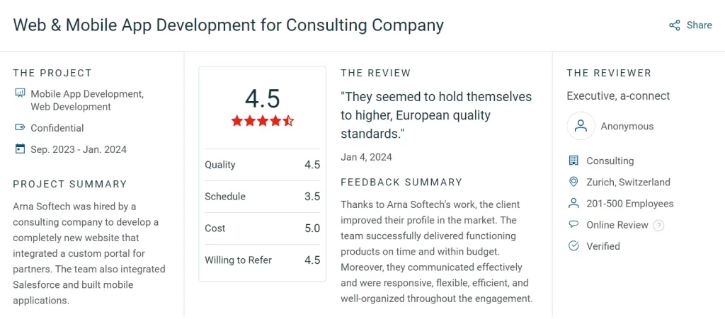 "They seemed to hold themselves to higher, European quality standards." Thanks to Arna Softech’s work, the client improved their profile in the market. The team successfully delivered functioning products on time and within budget. Moreover, they communicated effectively and were responsive, flexible, efficient, and well-organized throughout the engagement.