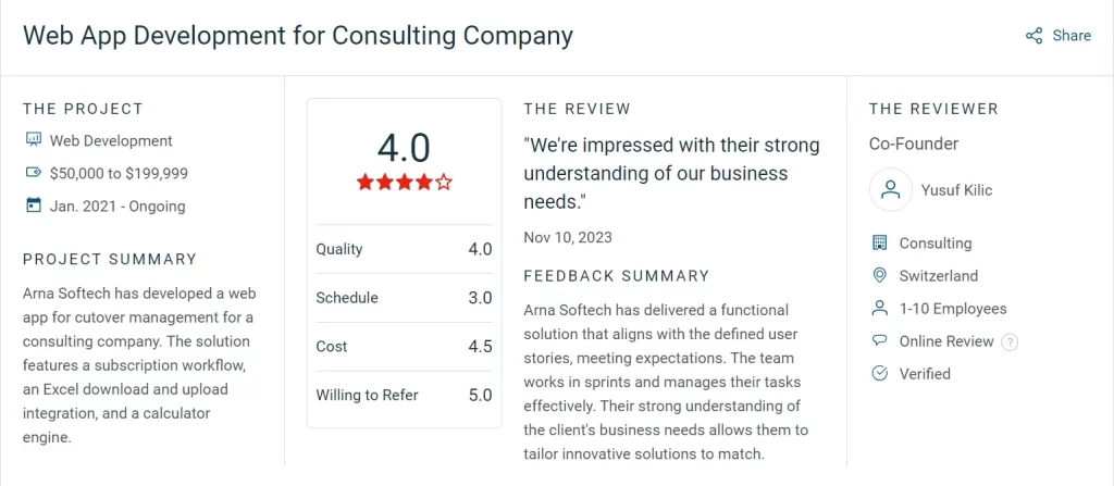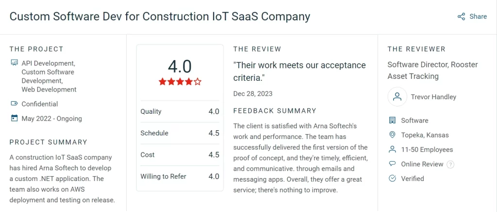"Their work meets our acceptance criteria." The client was satisfied with Arna Softech's work and performance. The team has successfully delivered the first version of the proof of concept, and they're timely, efficient, and communicative. through emails and messaging apps. Overall, they offer a great service; there's nothing to improve.